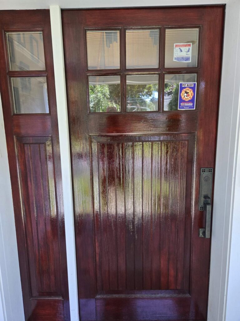 Once the door was prepped, we meticulously applied a new stain that complemented the home’s exterior while enhancing the wood’s natural grain. The transformation was finally sealed with a protective coat, ensuring its charm will stand the test of time and weather.