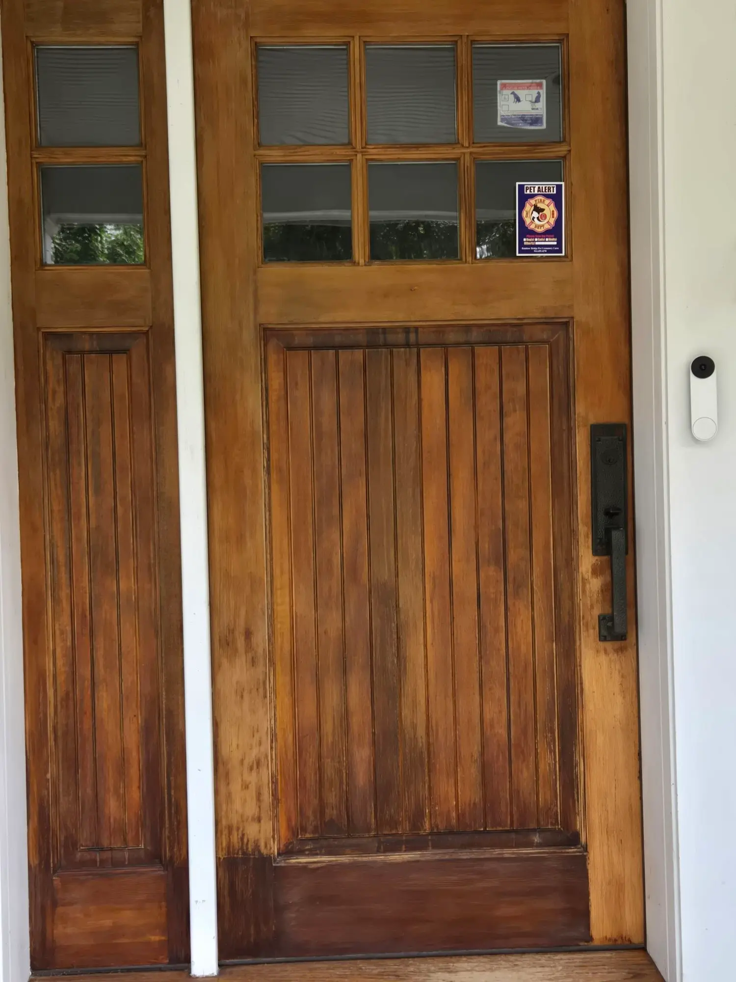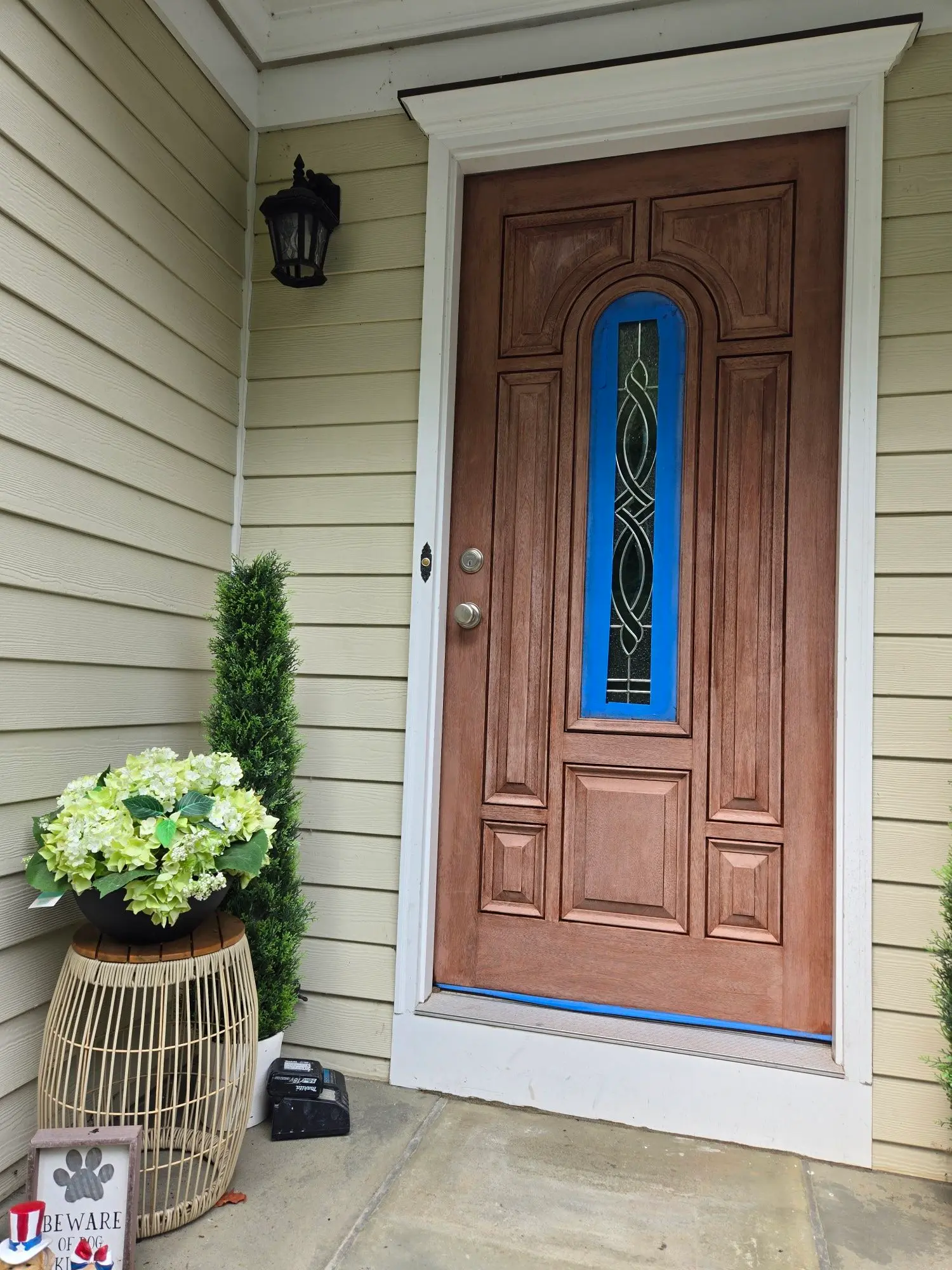 Once the door was prepped, we meticulously applied a new stain that complemented the home’s exterior while enhancing the wood’s natural grain. The transformation was finally sealed with a protective coat, ensuring its charm will stand the test of time and weather.